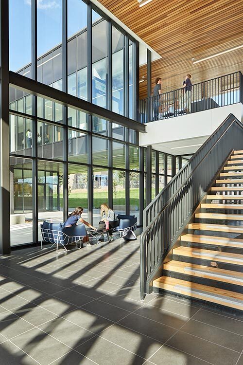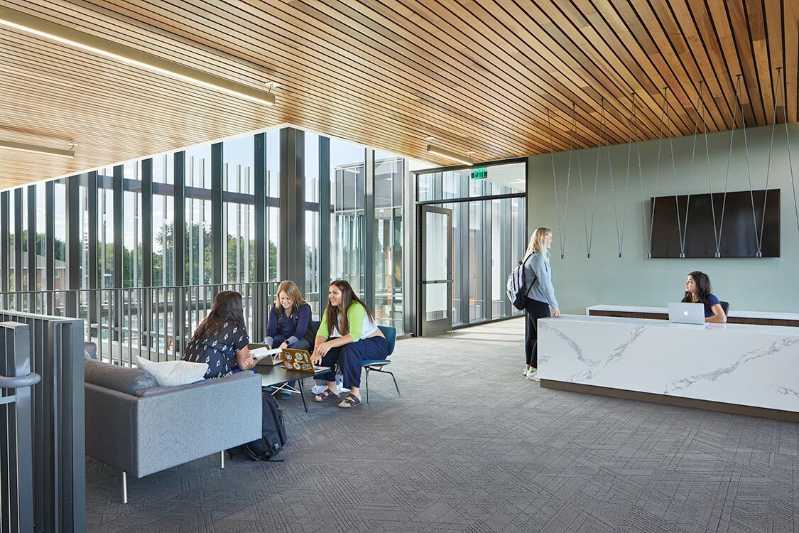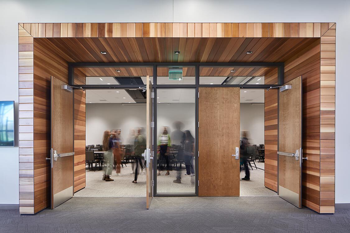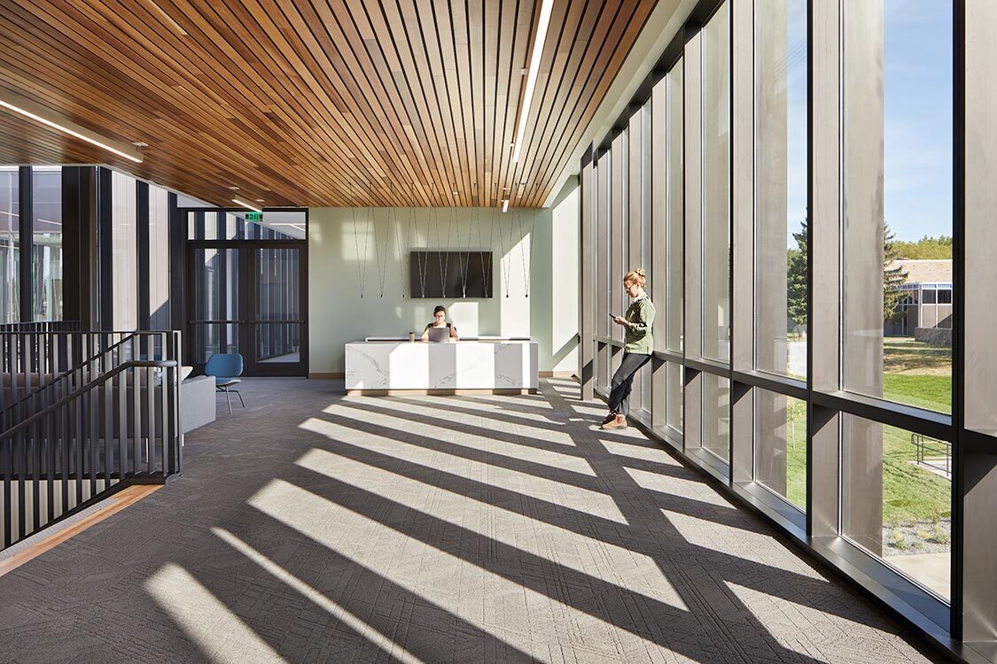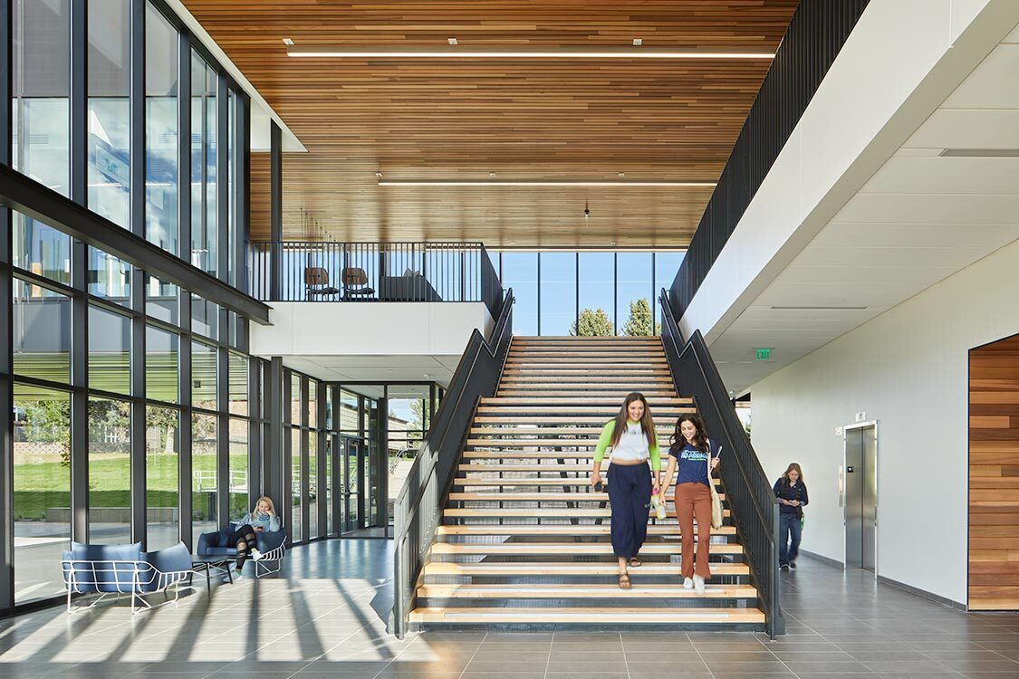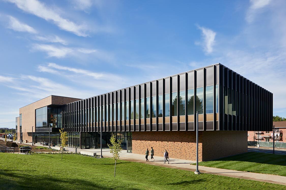 With a transparent façade constructed mostly of glass, the building’s inviting entryway loosens the barrier between off- and on-campus life. Offering a state-of-the-art, 300-person capacity multipurpose conference space and banquet room, the structure is a bridge to the Great Falls community and a home base for students.
